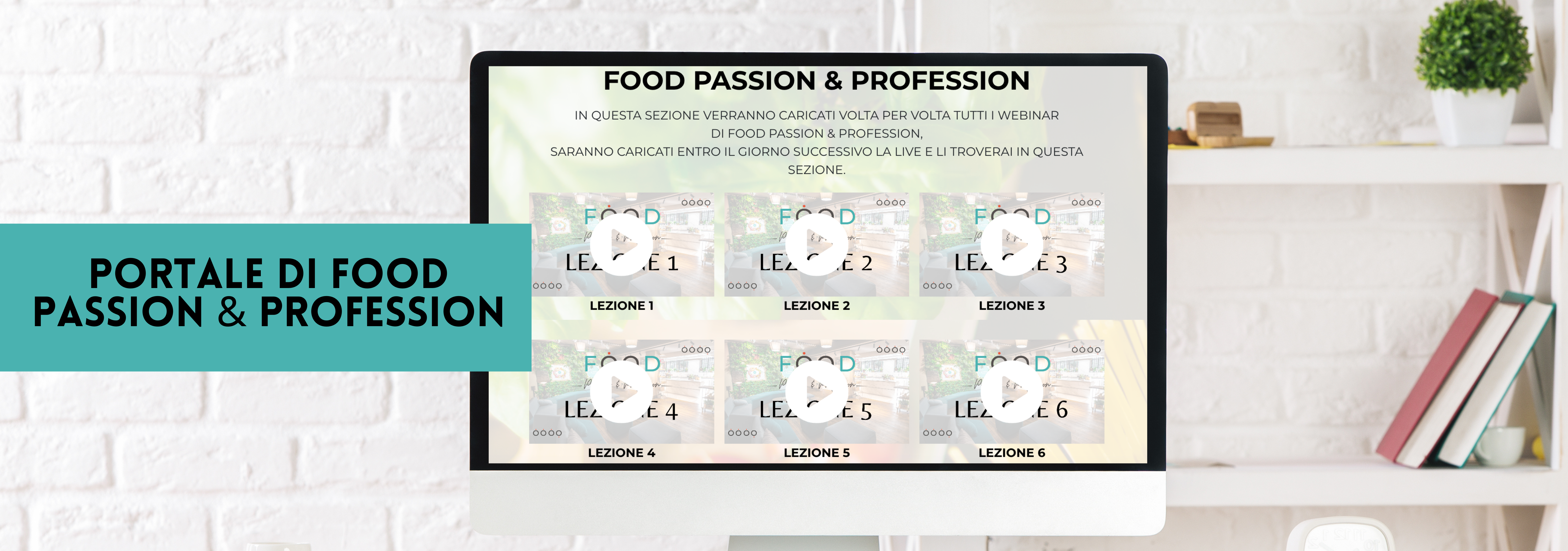 Tutte le lezioni saranno REGISTRATE e il materiale ti sarà, di volta in volta, rilasciato sul portale di FOOD PASSION & PROFESSION. Saranno inoltre caricati tutti gli esercizi da fare, e che puoi direttamente e fin da subito postare sui tuoi canali Social.